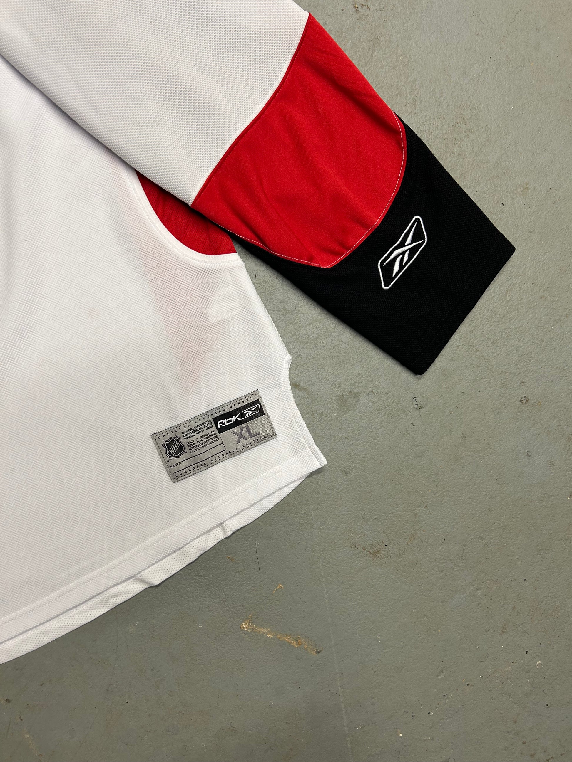 Clean white base jersey with Ottawa patches on shoulders All logos are stitched on Made with high quality soft materials from Reebok Featured players like Wade Redden and Daniel Alfredsson Ottawa senator logo in center with black and red details.