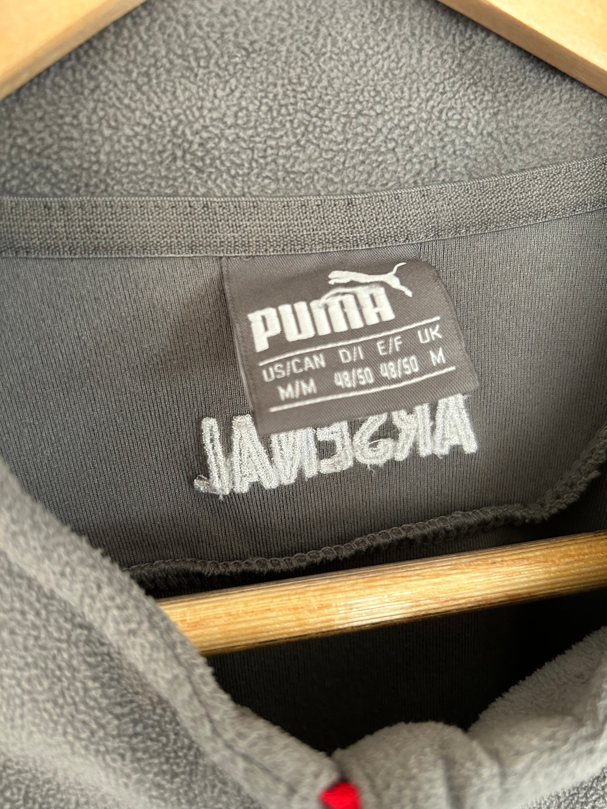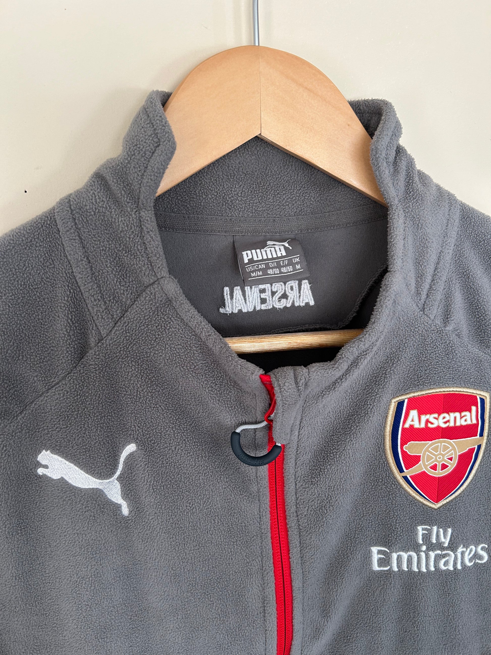 Gray Puma Quarter Zip Training Fleece with the soft cozy material and Fly Emirates Arsenal sponsor embroidered. Sleek side pockets in accented red