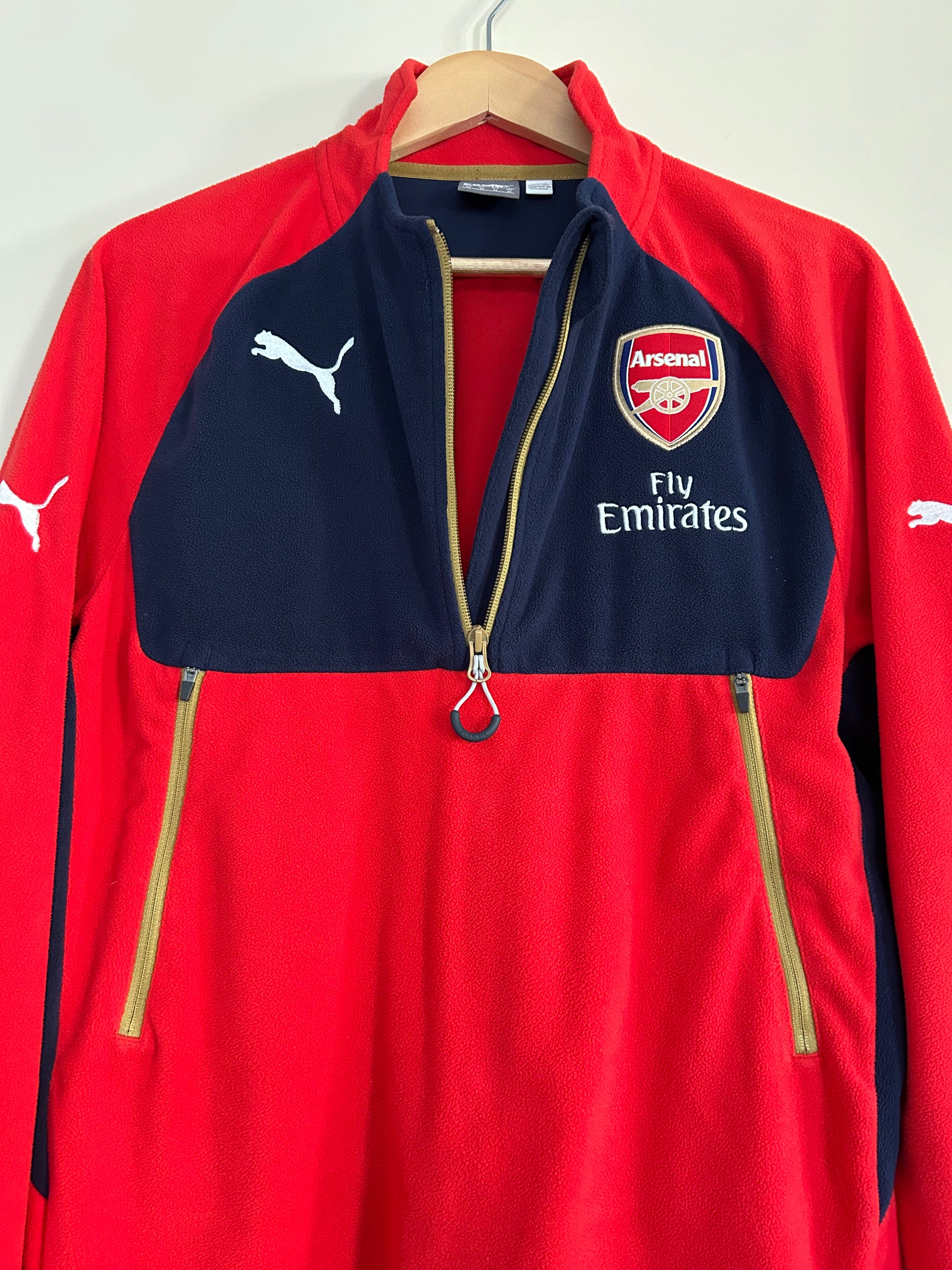 Puma Quarter Zip Training Fleece with the soft cozy material and Fly Emirates Arsenal sponsor embroidered. Sleek side pockets in accented gold.