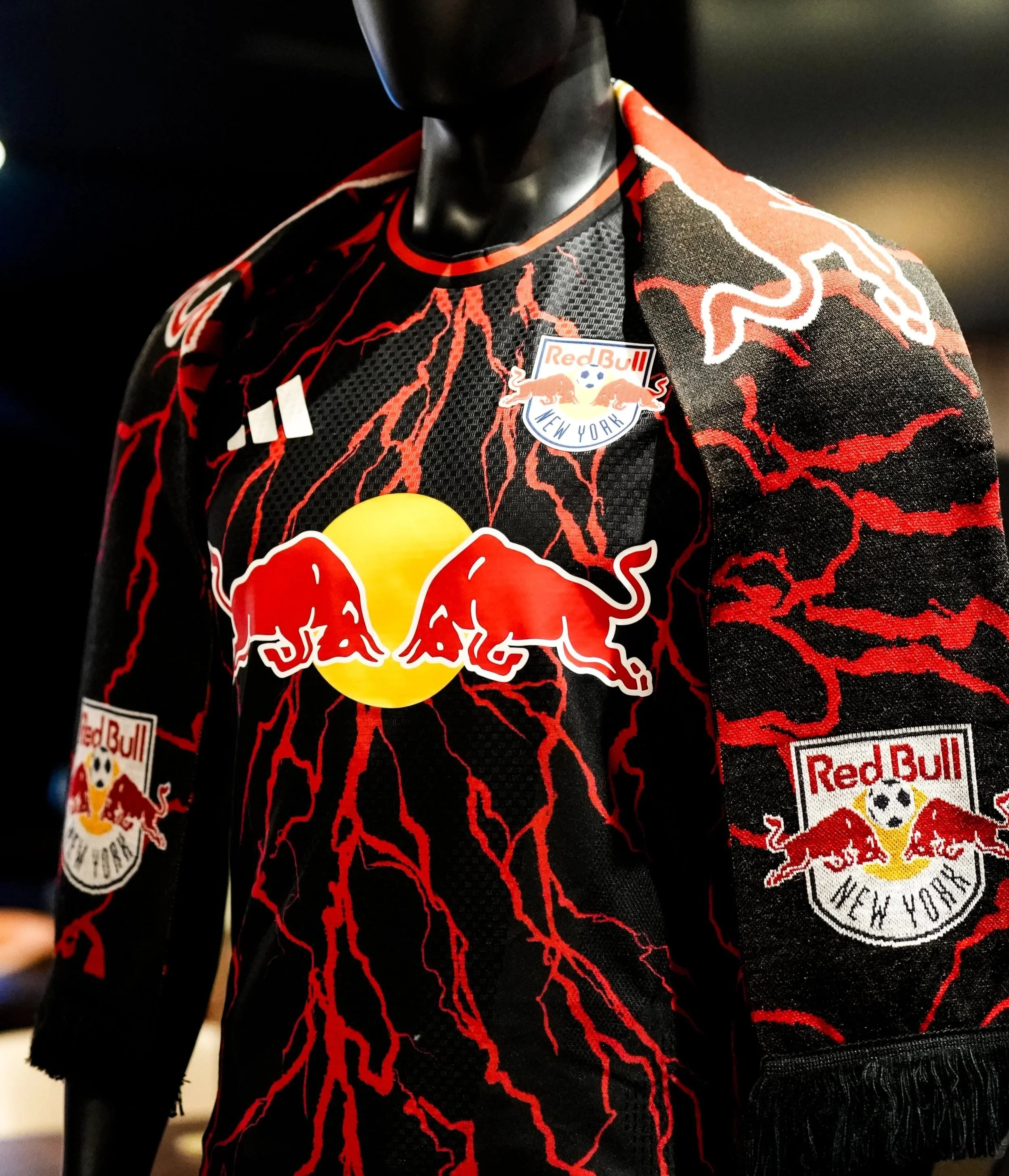 Red Bull New York also showcased the latest “ROOTED” kit which blends tradition with a bold, modern edge. Moving away from the usual white-dominant home look, the new primary kit uses a striking black base energized by red lightning-like accents that give it an aggressive, electric feel. The Red Bull slightly altered crest remains front and center, while subtle texture details and updated paneling modernize the silhouette for improved fit and on-field performance.